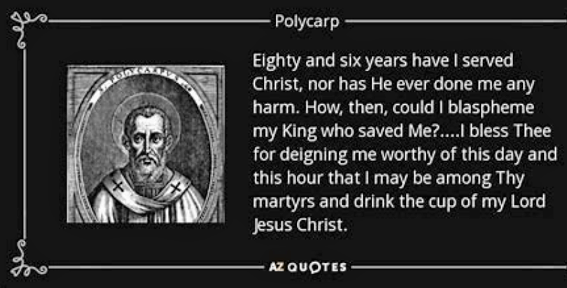 - The proconsul asked him whether he was Polycarp. On his confessing that he was, [the proconsul] sought to persuade him to deny [Christ]. “Eighty and six years have I served Him, and He never did me any injury: how then can I blaspheme my King and my Savior?” The proconsul then said to him, “I have wild beasts at hand; to these will I cast thee, except thou repent.” But he answered, “Call them then, for we are not accustomed to repent of what is good in order to adopt that which is evil.” But again the proconsul said to him, “I will cause thee to be consumed by fire, seeing thou despise the wild beasts, if thou wilt not repent.” But Polycarp said, “Thou threaten me with fire which burns for an hour, and after a little is extinguished, but art ignorant of the fire of the coming judgment and of eternal punishment, reserved for the ungodly. But why tarry thou? Bring forth what thou wilt. O Lord God Almighty, the Father of thy beloved and blessed Son Jesus Christ…I give Thee thanks that Thou hast counted me, worthy of this day and this hour, that I should have a part in the number of Thy martyrs.” — The Martyrdom of Polycarp.