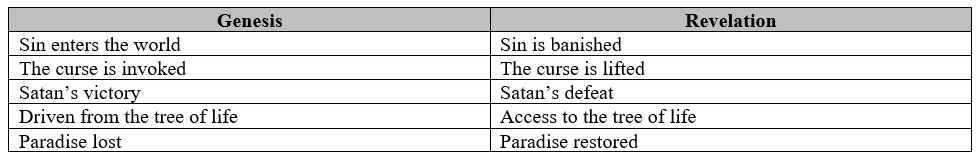 Alpha and Omega – Genesis (the Alpha of the Old Testament) and Revelation (the Omega of the New Testament) serve as bookends to the Scriptures. The last book presents man reconciled to God and readmitted to paradise, as the first book presented man losing his innocence, separated from God and expelled from paradise.