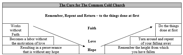 They could not “tolerate wicked people.” They would not listen to false teachers. They did not grow weary even though the work had been difficult. In every way, it was a successful church from the human point of view. Some of today’s busy churches with their full calendars and weary workers might fit this description as well. But the Son of Man, walking in the midst of the church saw what was missing. They had forsaken (intentional?) not forgotten (unintentional?) their first love (Jeremiah 2:2). The local church is espoused to Christ (2 Corinthians 11:2), but there is always the danger of that love growing cold (a warning in the Olivet Discourse). Like Martha, we can be so busy working for Christ that we have no time to love Him (Luke 10:38–42). Christ is more concerned about what we do with Him than for Him. To the public, the Ephesian church was successful. To Christ, it had fallen away.