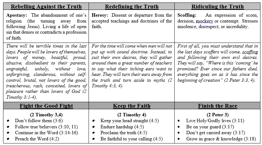 Apostasy has always been a danger to the church, but the end times before the Lord returns, will be characterized by widespread apostasy, heresy and scoffing. During such things, Christians must fight the good fight, keep the faith, and finish the race.