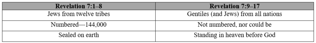 Apparently, during this unprecedented time of Great Tribulation that is to fall upon the earth, there will be a vast company of repentant Israelites that will be sealed for preservation, and a great multitude of the Gentiles, that will be moved to repentance toward Christ. These two groups appear to be separate and distinct from the Church, which may have been already raptured by this time. These two groups of people are depicted in Figure 14.1.