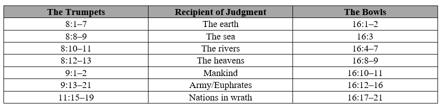 There is also a parallel between the seven trumpets and the seven bowls of Revelation 15–16. It seems that the seven bowls are intensified trumpet judgments. It is possible that the trumpet judgments belong to the first three and one-half years of the tribulation, while the bowls are poured out during the last three and one-half years, when God’s wrath is intensified. The second half of the tribulation (the great tribulation) is referred to as “the wrath of God” (Revelation 14:10; 15:7). And there is no denying that this is the unleashing of God’s wrath, as the judgments of come straight from the throne of God.