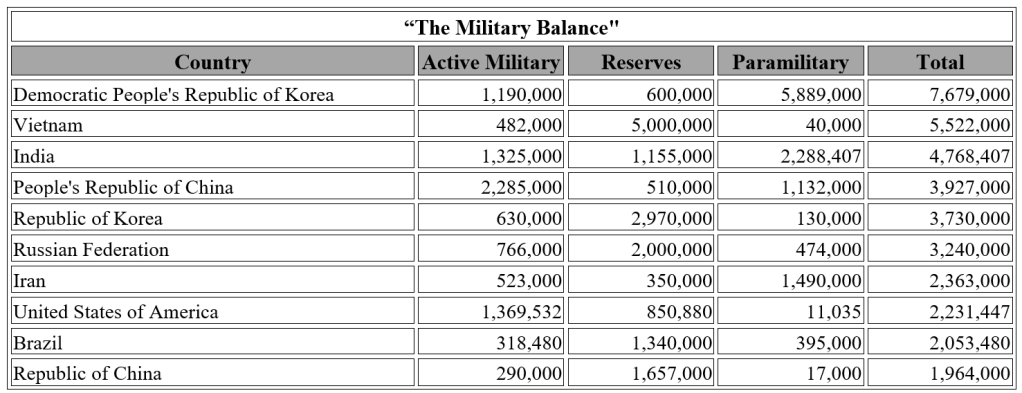 Years ago, Red China claimed to have an army of 200 million (Time, May 21, 1965, p. 35), was likely propaganda. More recent estimates of the militaries of various countries are more modest. However, with increasing tensions in Europe (Russia and Ukraine) and Asia (China and Taiwan), it is not inconceivable that a country as populous (1.4 billion) and wealthy as China could not raise such an army before the period being prophesied here.