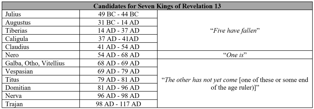 The Nero theory harmonizes nicely with the Olivet Discourse (“this generation shall not pass away”), assuming that John was incarcerated on Patmos during this period. The reference in Revelation 17:10 to “seven kings,” of whom “five have fallen, one is, and the other has not yet come,” also fits well with this dating. Nero was sixth in the line of Roman emperors. Five had fallen (Julius, Augustus, Tiberius, Caligula, Claudius), one is (Nero), and the other has not yet come (one of the successive Caesars or perhaps a far future, end-times anti-Christ?).